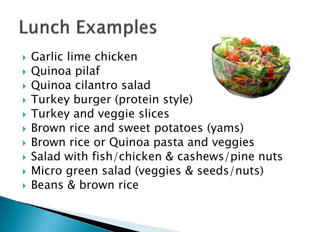 Lunch Examples • Garlic lime chicken • Quinoa pilaf • Quinoa cilantro salad • Turkey burger (protein style) • Turkey and veggie slices • Brown rice and sweet potatoes (yams) • Brown rice or Quinoa pasta and veggies • Salad with fish/chicken & cashews/pine nuts • Micro green salad (veggies & seeds/nuts) • Beans & brown rice