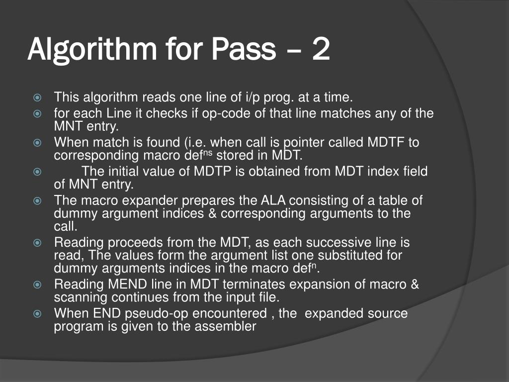 Algorithm for Pass – 2 • This algorithm reads one line of i/p prog. at a time. • for each Line it checks if op-code of that line matches any of the MNT entry. • When match is found (i.e. when call is pointer called MDTF to corresponding macro defns stored in MDT. • The initial value of MDTP is obtained from MDT index field of MNT entry. • The macro expander prepares the ALA consisting of a table of dummy argument indices & corresponding arguments to the call. • Reading proceeds from the MDT, as each successive line is read, The values form the argument list one substituted for dummy arguments indices in the macro defn. • Reading MEND line in MDT terminates expansion of macro & scanning continues from the input file. • When END pseudo-op encountered , the expanded source program is given to the assembler