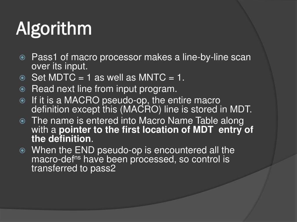 Algorithm • Pass1 of macro processor makes a line-by-line scan over its input. • Set MDTC = 1 as well as MNTC = 1. • Read next line from input program. • If it is a MACRO pseudo-op, the entire macro definition except this (MACRO) line is stored in MDT. • The name is entered into Macro Name Table along with a pointer to the first location of MDT entry of the definition. • When the END pseudo-op is encountered all the macro-defns have been processed, so control is transferred to pass2