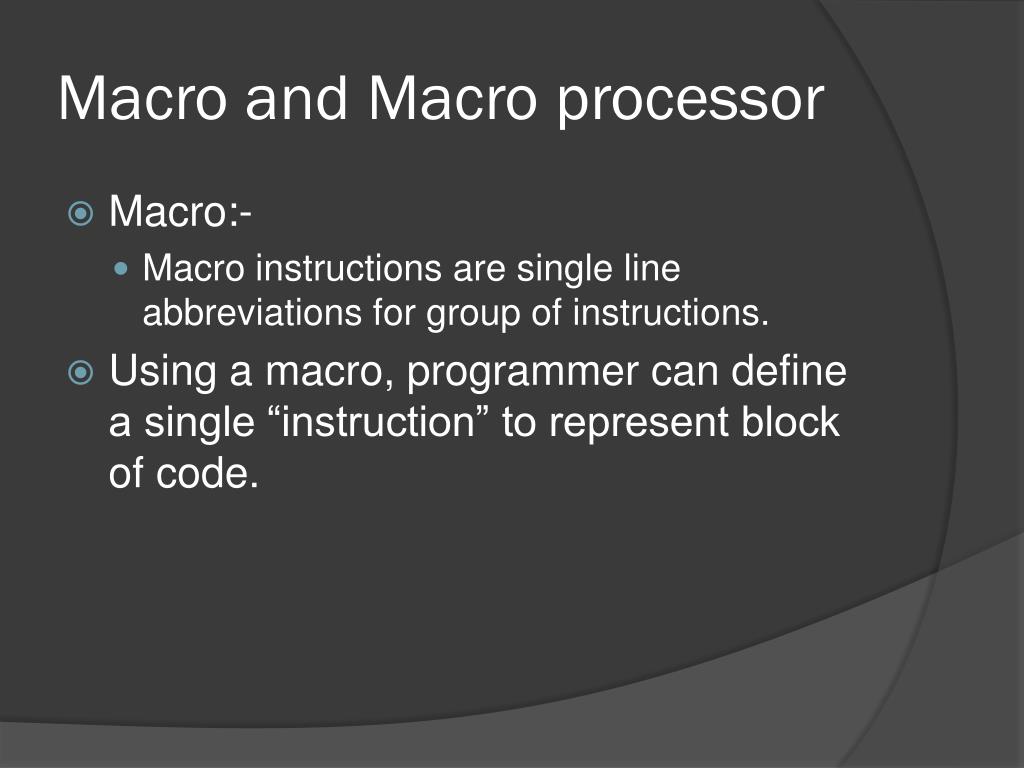 Macro and Macro processor • Macro:- • Macro instructions are single line abbreviations for group of instructions. • Using a macro, programmer can define a single “instruction” to represent block of code.
