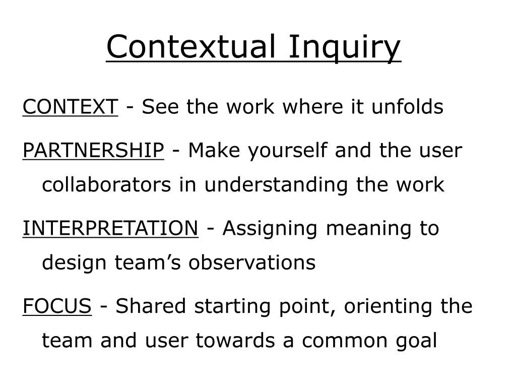 Contextual Inquiry CONTEXT - See the work where it unfolds PARTNERSHIP - Make yourself and the user collaborators in understanding the work INTERPRETATION - Assigning meaning to design team’s observations FOCUS - Shared starting point, orienting the team and user towards a common goal