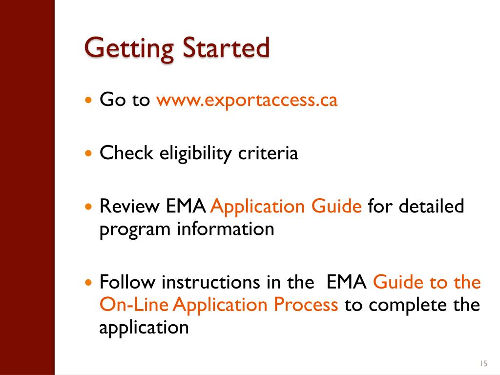 Getting Started • Go to www.exportaccess.ca • Check eligibility criteria • Review EMA Application Guide for detailed program information • Follow instructions in the EMA Guide to the On-Line Application Process to complete the application