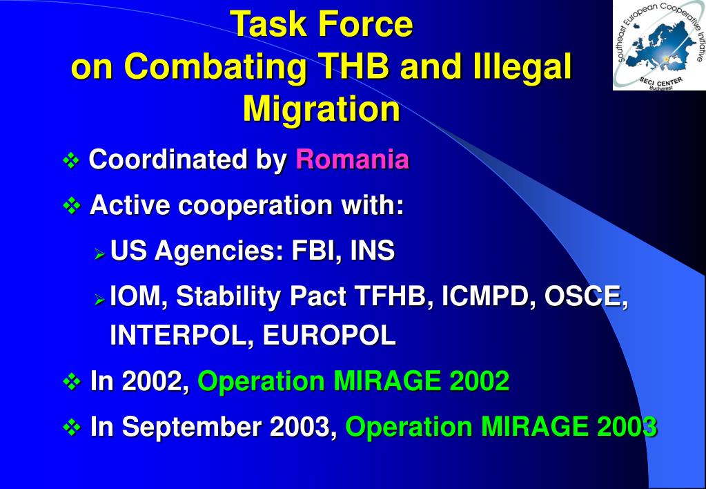 Task Forceon Combating THB and Illegal Migration • Coordinated by Romania • Active cooperation with: • US Agencies: FBI, INS • IOM, Stability Pact TFHB, ICMPD, OSCE, INTERPOL, EUROPOL • In 2002, Operation MIRAGE 2002 • In September 2003, Operation MIRAGE 2003
