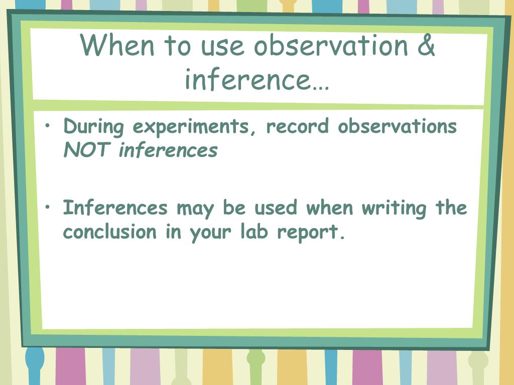 When to use observation & inference… • During experiments, record observations NOT inferences • Inferences may be used when writing the conclusion in your lab report.