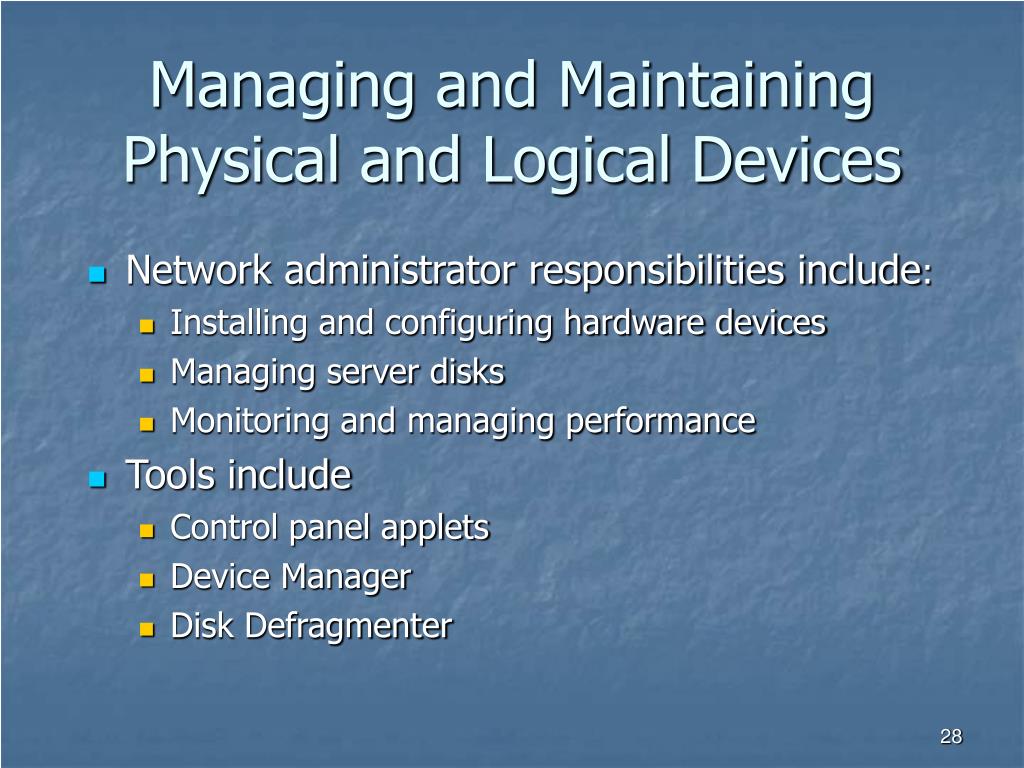 Managing and Maintaining Physical and Logical Devices • Network administrator responsibilities include: • Installing and configuring hardware devices • Managing server disks • Monitoring and managing performance • Tools include • Control panel applets • Device Manager • Disk Defragmenter