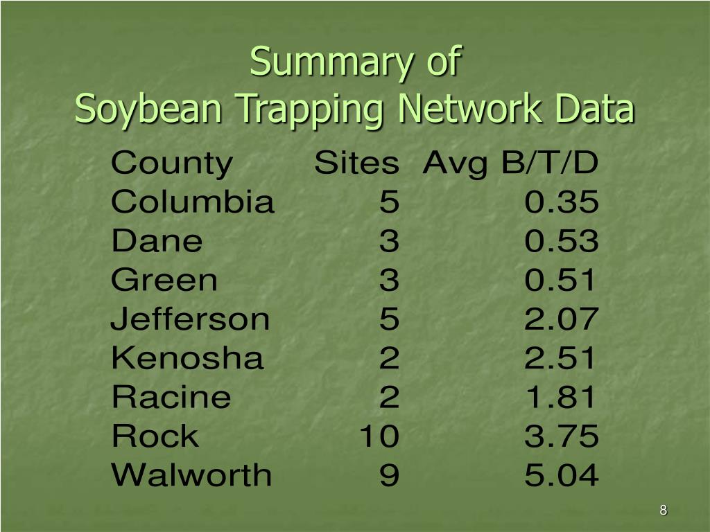 Goal of Analysis • Estimate the $/ac Net Benefit for a seed treatment, soil insecticide, and YieldGard Rootworm in first year corn • Convert beetles/trap/day from Soybean Trapping Network into $/ac Net Benefit • Costs: use Peg Reedy’s work • Benefits: more difficult—link entomology field research and economics