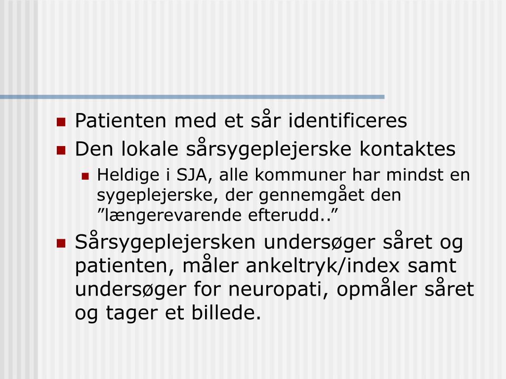 Patienten med et sår identificeres • Den lokale sårsygeplejerske kontaktes • Heldige i SJA, alle kommuner har mindst en sygeplejerske, der gennemgået den ”længerevarende efterudd..” • Sårsygeplejersken undersøger såret og patienten, måler ankeltryk/index samt undersøger for neuropati, opmåler såret og tager et billede.