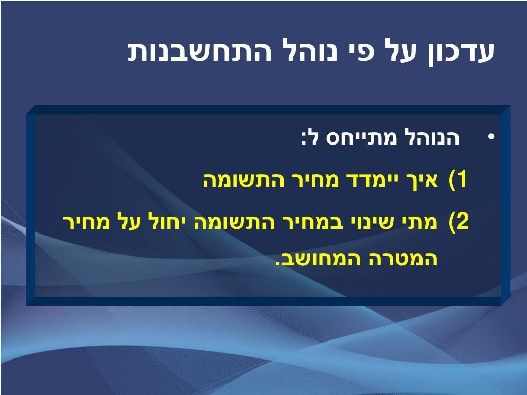 עדכון על פי נוהל התחשבנות • הנוהל מתייחס ל: • איך יימדד מחיר התשומה • מתי שינוי במחיר התשומה יחול על מחיר המטרה המחושב.