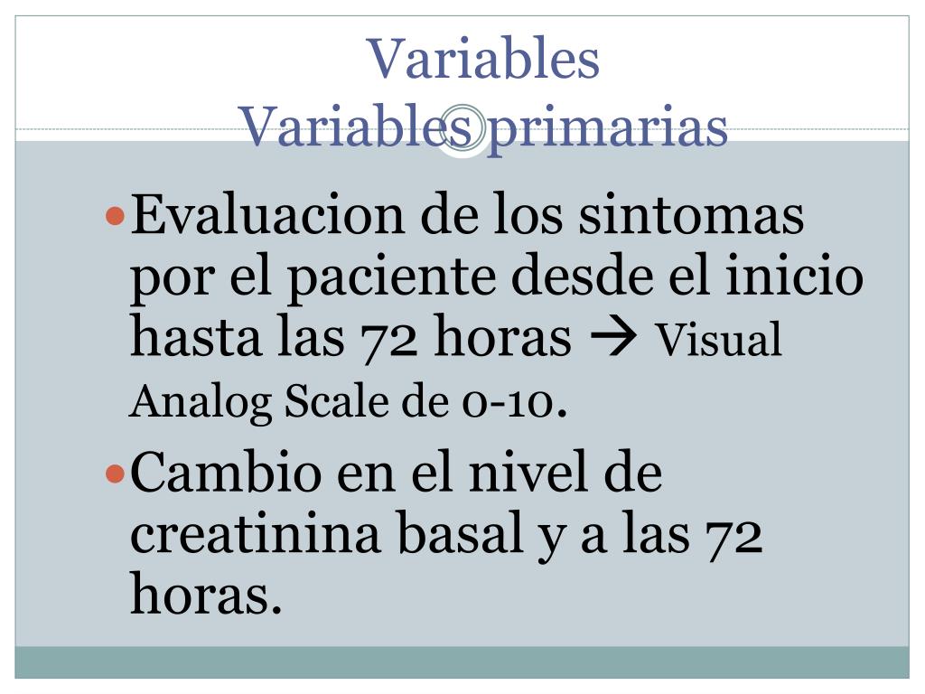 VariablesVariables primarias Evaluacion de los sintomas por el paciente desde el inicio hasta las 72 horas Visual AnalogScale de 0-10. Cambio en el nivel de creatinina basal y a las 72 horas.