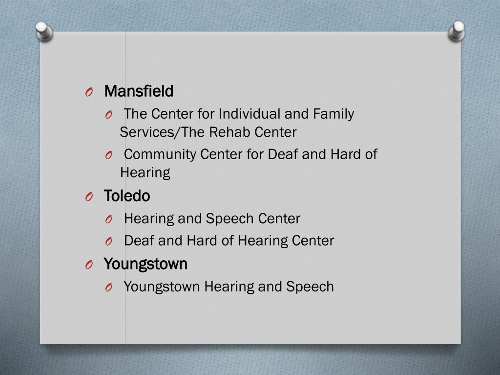 Mansfield • The Center for Individual and Family Services/The Rehab Center • Community Center for Deaf and Hard of Hearing • Toledo • Hearing and Speech Center • Deaf and Hard of Hearing Center • Youngstown • Youngstown Hearing and Speech