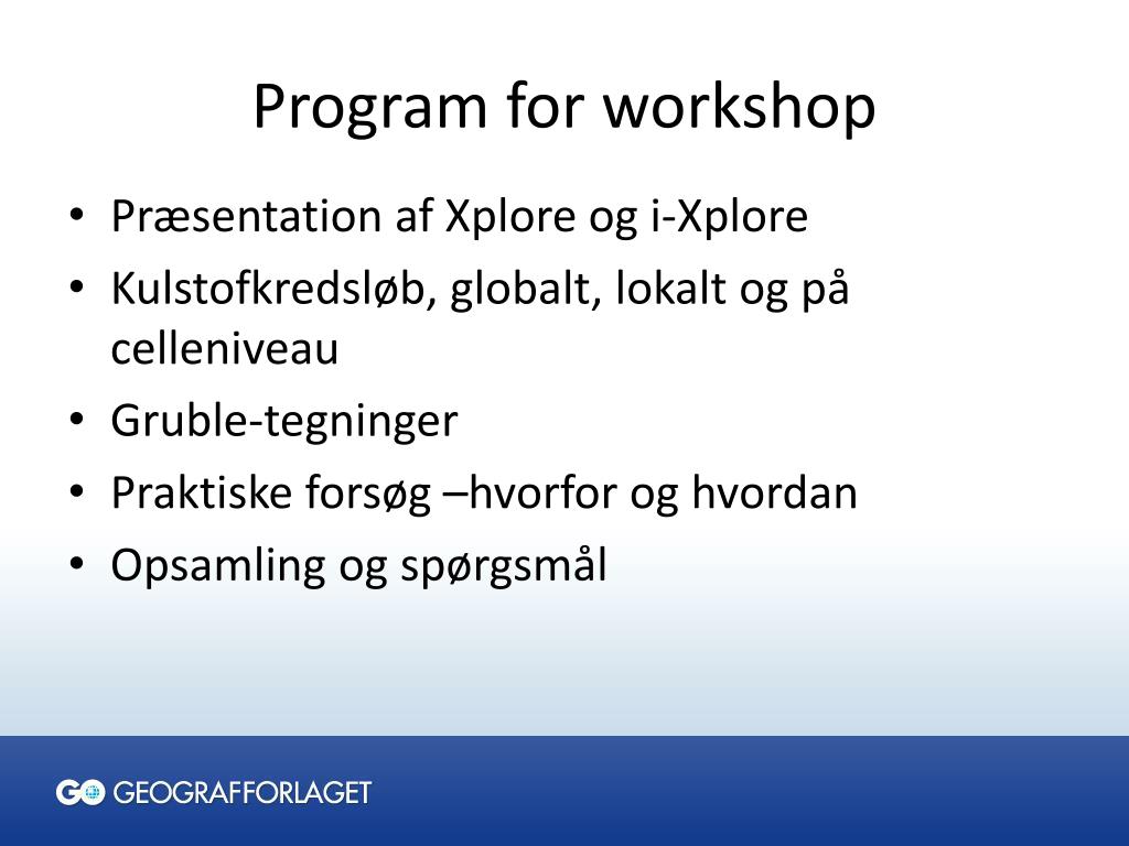 Program for workshop • Præsentation af Xplore og i-Xplore • Kulstofkredsløb, globalt, lokalt og på celleniveau • Gruble-tegninger • Praktiske forsøg –hvorfor og hvordan • Opsamling og spørgsmål