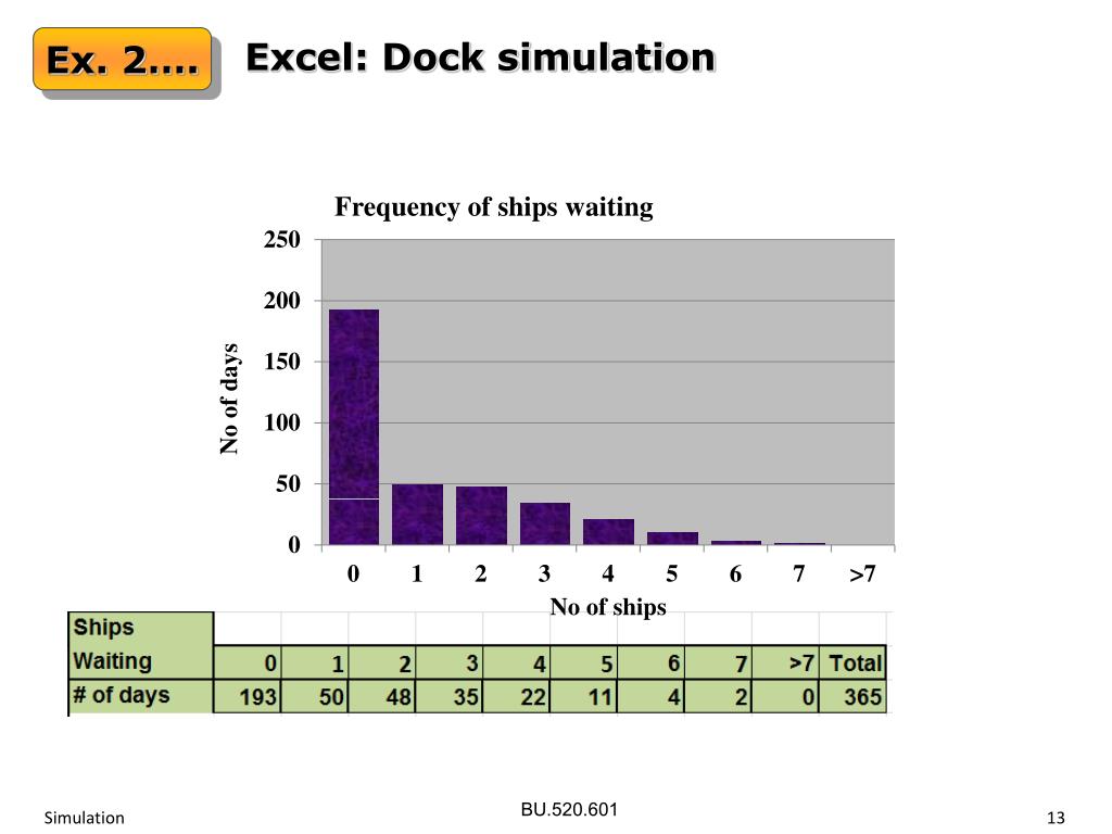 Ex. 2….. Excel: Dock simulation • Arrivals are generated with HLOOKUP. Simulation