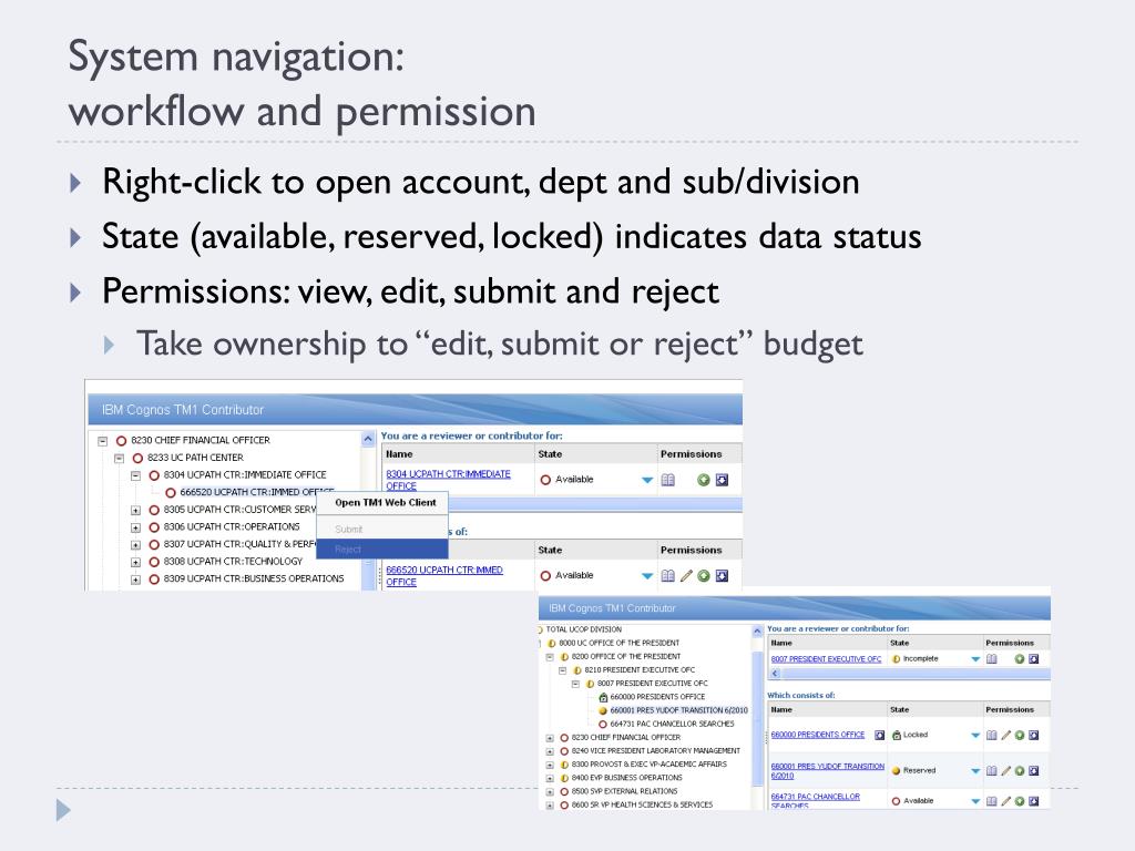 System navigation: workflow and permission • Right-click to open account, dept and sub/division • State (available, reserved, locked) indicates data status • Permissions: view, edit, submit and reject • Take ownership to “edit, submit or reject” budget