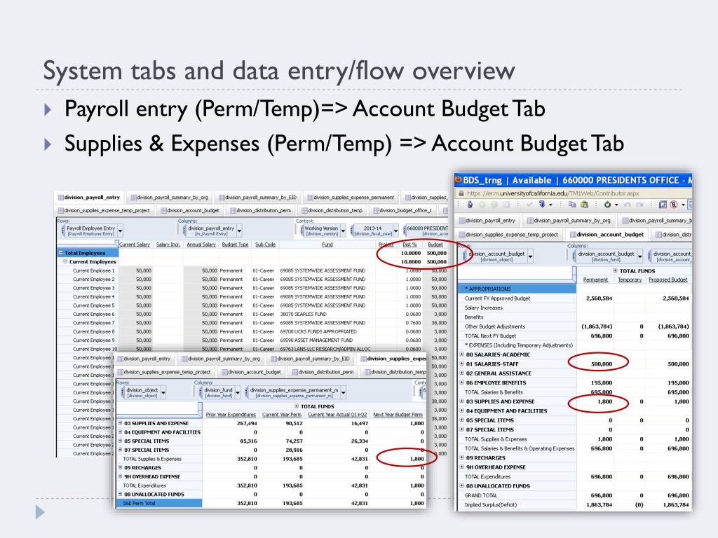 System tabs and data entry/flow overview • Payroll entry (Perm/Temp)=> Account Budget Tab • Supplies & Expenses (Perm/Temp) => Account Budget Tab