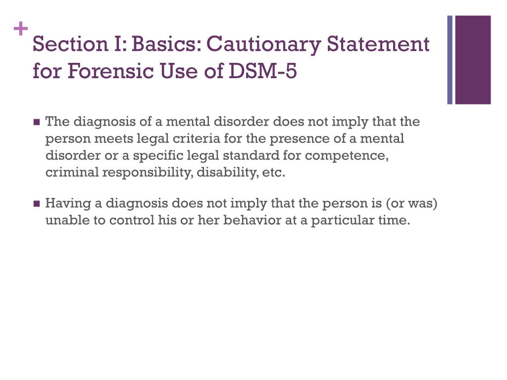 Section I: Basics: Cautionary Statement for Forensic Use of DSM-5 • The diagnosis of a mental disorder does not imply that the person meets legal criteria for the presence of a mental disorder or a specific legal standard for competence, criminal responsibility, disability, etc. • Having a diagnosis does not imply that the person is (or was) unable to control his or her behavior at a particular time.
