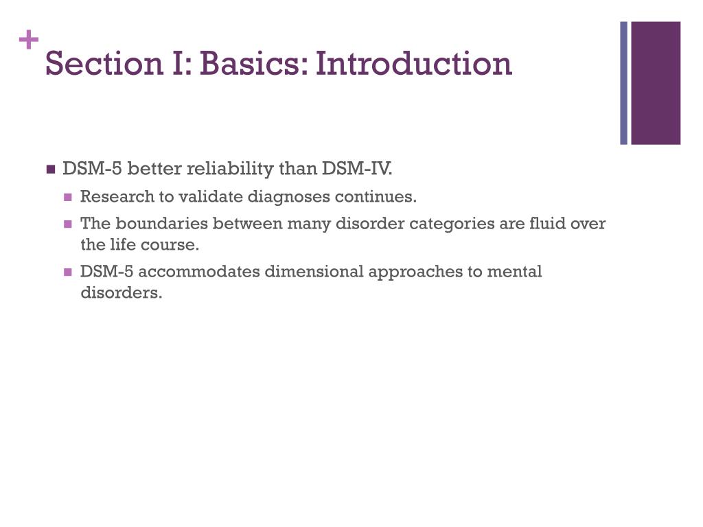 Section I: Basics: Introduction • DSM-5 better reliability than DSM-IV. • Research to validate diagnoses continues. • The boundaries between many disorder categories are fluid over the life course. • DSM-5 accommodates dimensional approaches to mental disorders.