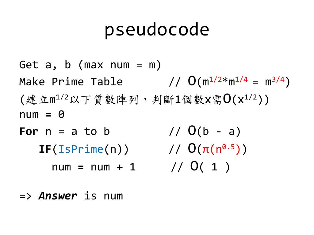 pseudocode Get a, b (max num = m) Make Prime Table// O(m1/2*m1/4 = m3/4) (建立m1/2以下質數陣列,判斷1個數x需O(x1/2)) num =0 For n = a to b// O(b - a) IF(IsPrime(n))// O(π(n0.5)) num = num + 1 // O( 1 ) => Answer is num