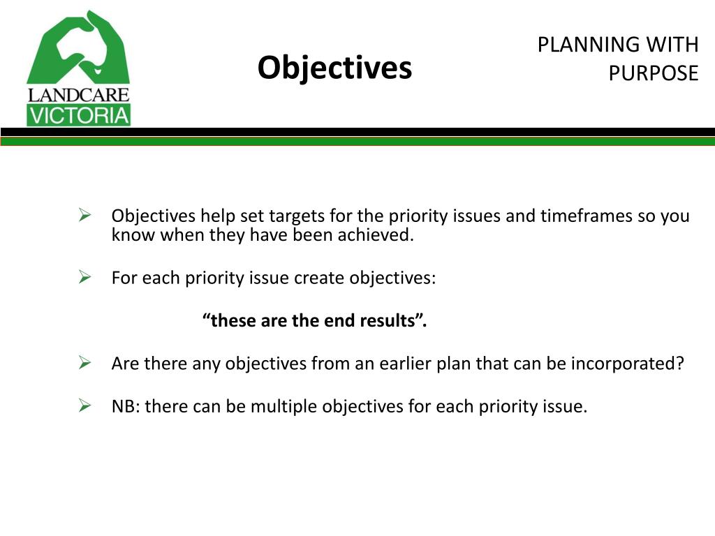 Objectives Objectives help set targets for the priority issues and timeframes so you know when they have been achieved. For each priority issue create objectives: “these are the end results”. Are there any objectives from an earlier plan that can be incorporated? NB: there can be multiple objectives for each priority issue.