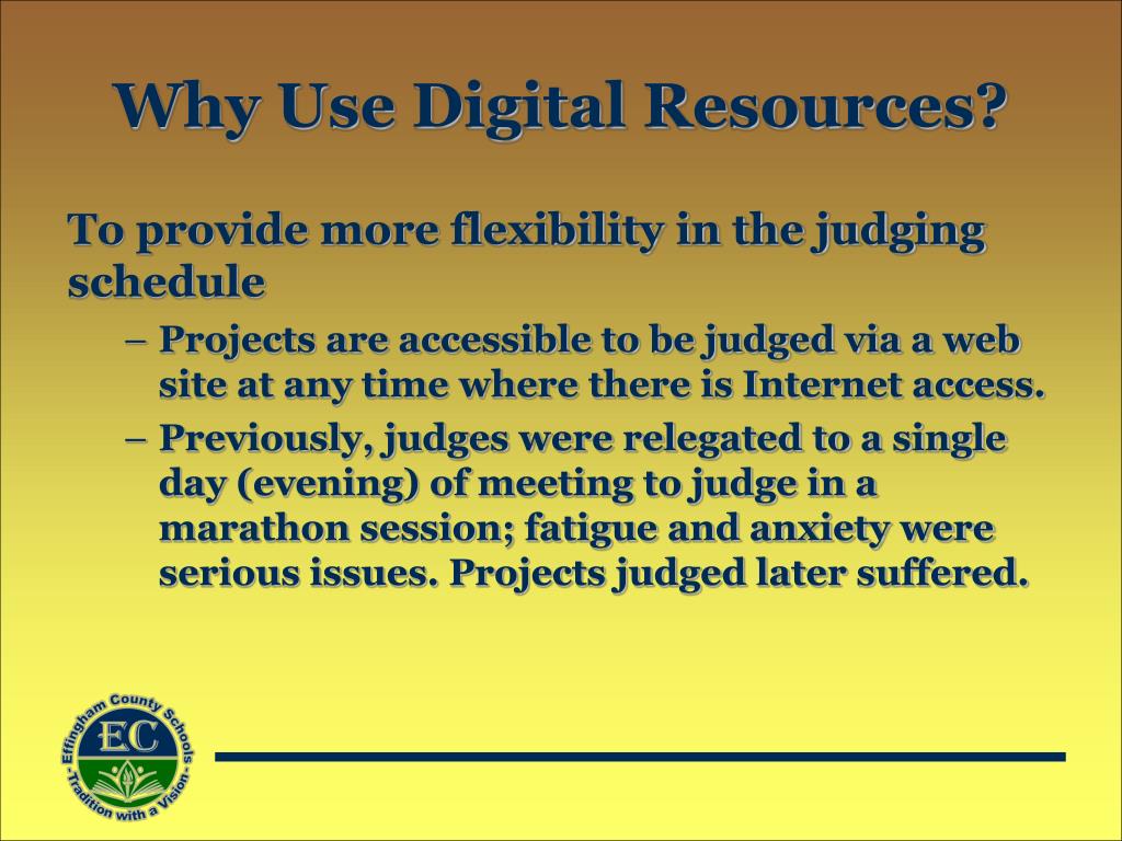 Why Use Digital Resources? To provide more flexibility in the judging schedule • Projects are accessible to be judged via a web site at any time where there is Internet access. • Previously, judges were relegated to a single day (evening) of meeting to judge in a marathon session; fatigue and anxiety were serious issues. Projects judged later suffered.