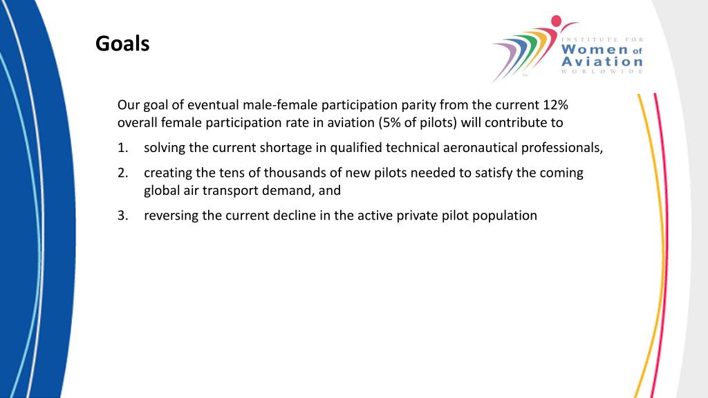 Goals Our goal of eventual male-female participation parity from the current 12% overall female participation rate in aviation (5% of pilots) will contribute to • solving the current shortage in qualified technical aeronautical professionals, • creating the tens of thousands of new pilots needed to satisfy the coming global air transport demand, and • reversing the current decline in the active private pilot population