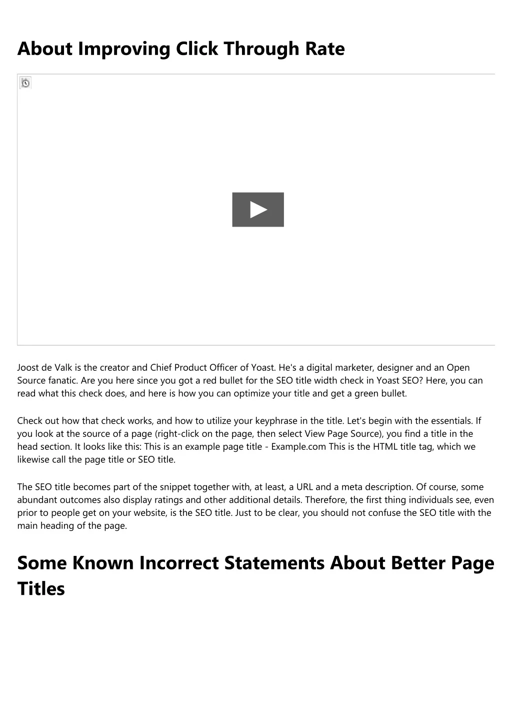 1. About Improving Click Through Rate Joost de Valk is the creator and Chief Product Officer of Yoast. He's a digital marketer, designer and an Open Source fanatic. Are you here since you got a red bullet for the SEO title width check in Yoast SEO? Here, you can read what this check does, and here is how you can optimize your title and get a green bullet. Check out how that check works, and how to utilize your keyphrase in the title. Let's begin with the essentials. If you look at the source of a page (right-click on the page, then select View Page Source), you find a title in the head section. It looks like this: This is an example page title - Example.com This is the HTML title tag, which we likewise call the page title or SEO title. The SEO title becomes part of the snippet together with, at least, a URL and a meta description. Of course, some abundant outcomes also display ratings and other additional details. Therefore, the first thing individuals see, even prior to people get on your website, is the SEO title. Just to be clear, you should not confuse the SEO title with the main heading of the page. Some Known Incorrect Statements About Better Page Titles