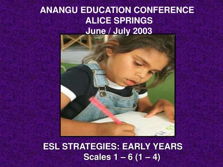 ANANGU EDUCATION CONFERENCE ALICE SPRINGS June / July 2003 ESL STRATEGIES: EARLY YEARS Scales 1 – 6 (1 – 4)