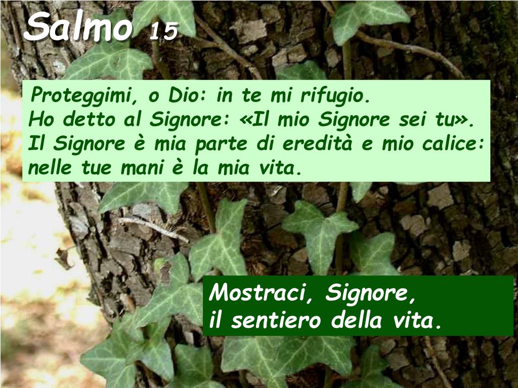 Salmo 15 Proteggimi, o Dio: in te mi rifugio.Ho detto al Signore: «Il mio Signore sei tu».Il Signore è mia parte di eredità e mio calice:nelle tue mani è la mia vita. Mostraci, Signore, il sentiero della vita.