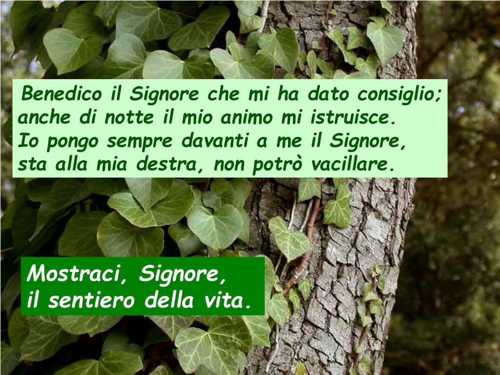 Benedico il Signore che mi ha dato consiglio;anche di notte il mio animo mi istruisce.Io pongo sempre davanti a me il Signore,sta alla mia destra, non potrò vacillare. Mostraci, Signore, il sentiero della vita.