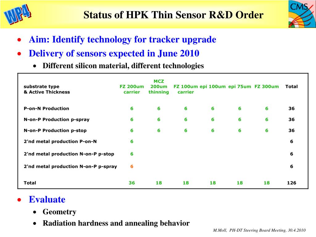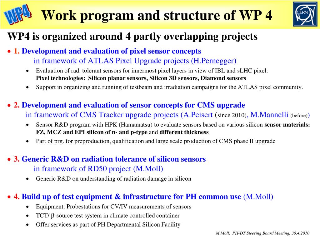 Work program and structure of WP 4 WP4 is organized around 4 partly overlapping projects • 1. Development and evaluation of pixel sensor concepts in framework of ATLAS Pixel Upgrade projects (H.Pernegger) • Evaluation of rad. tolerant sensors for innermost pixel layers in view of IBL and sLHC pixel:Pixel technologies: Silicon planar sensors, Silicon 3D sensors, Diamond sensors • Support in organizing and running of testbeam and irradiation campaigns for the ATLAS pixel community. • 2. Development and evaluation of sensor concepts for CMS upgrade in framework of CMS Tracker upgrade projects (A.Peisert(since 2010), M.Mannelli(before)) • Sensor R&D program with HPK (Hamamatsu) to evaluate sensors based on various silicon sensor materials: FZ, MCZ and EPI silicon of n- and p-type and different thickness • Part of prg. for preproduction, qualification and large scale production of CMS phase II upgrade • 3. Generic R&D on radiation tolerance of silicon sensors in framework of RD50 project (M.Moll) • Generic R&D on understanding of radiation damage in silicon • 4. Build up of test equipment & infrastructure for PH common use (M.Moll) • Equipment: Probestations for CV/IV measurements of sensors • TCT/b-source test system in climate controlled container • Offer services as part of PH Departmental Silicon Facility M.Moll, PH-DT Steering Board Meeting, 30.4.2010