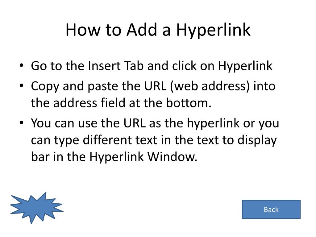 How to Add a Hyperlink • Go to the Insert Tab and click on Hyperlink • Copy and paste the URL (web address) into the address field at the bottom. • You can use the URL as the hyperlink or you can type different text in the text to display bar in the Hyperlink Window. Back