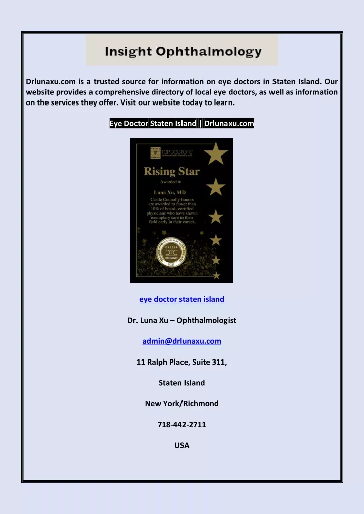 1. Drlunaxu.com is a trusted source for information on eye doctors in Staten Island. Our website provides a comprehensive directory of local eye doctors, as well as information on the services they offer. Visit our website today to learn. Eye Doctor Staten Island | Drlunaxu.com eye doctor staten island Dr. Luna Xu – Ophthalmologist admin@drlunaxu.com 11 Ralph Place, Suite 311, Staten Island New York/Richmond 718-442-2711 USA