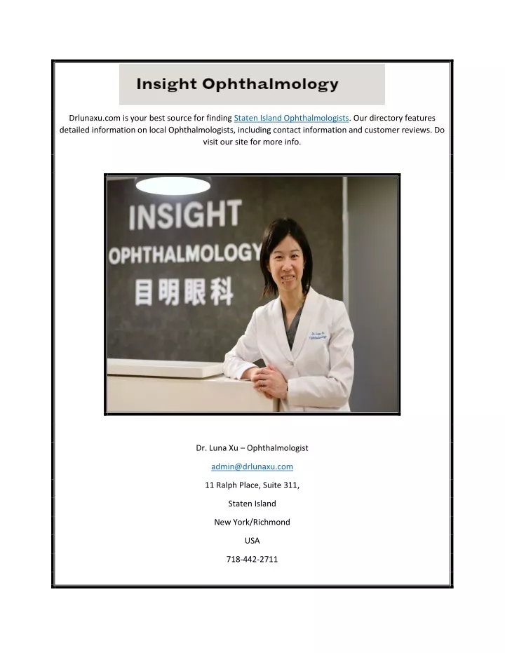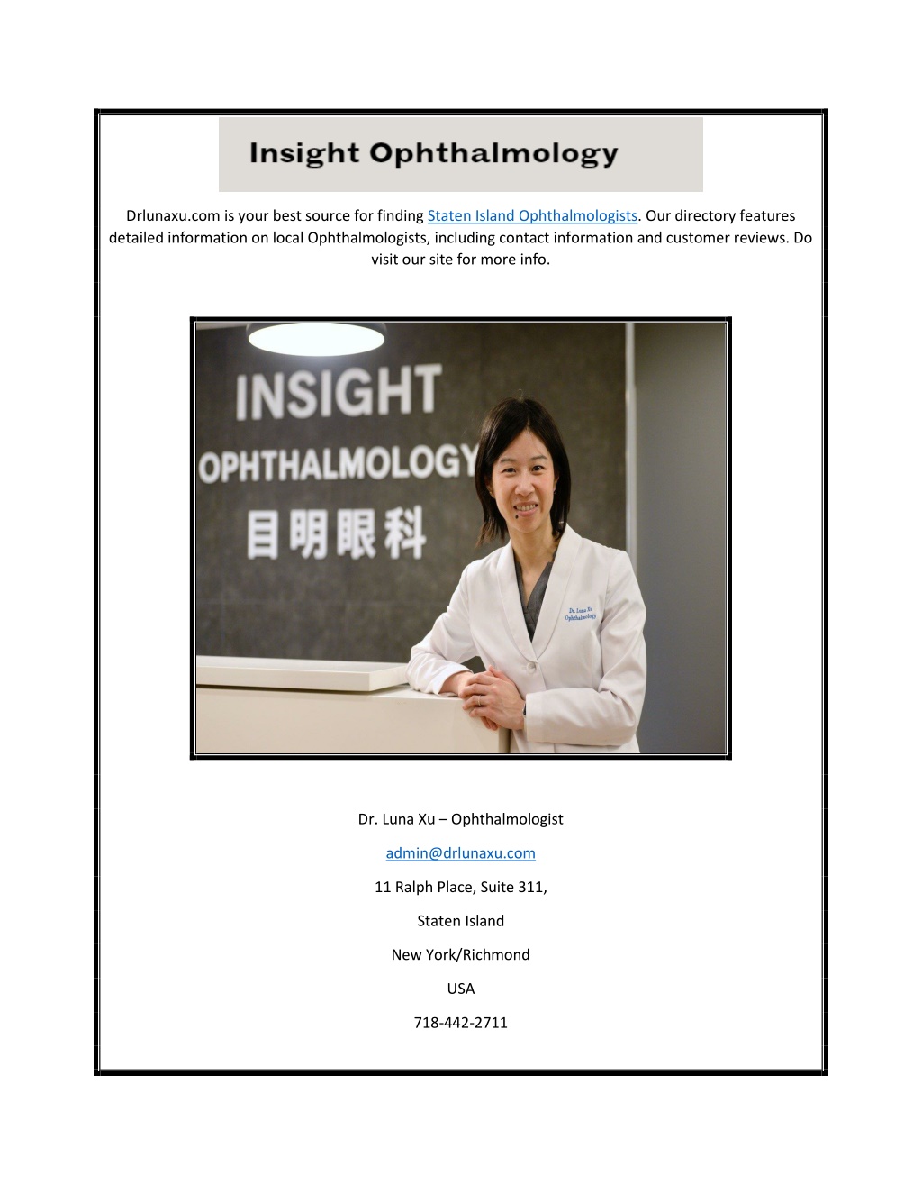 1. Drlunaxu.com is your best source for finding Staten Island Ophthalmologists. Our directory features detailed information on local Ophthalmologists, including contact information and customer reviews. Do visit our site for more info. Dr. Luna Xu – Ophthalmologist admin@drlunaxu.com 11 Ralph Place, Suite 311, Staten Island New York/Richmond USA 718-442-2711
