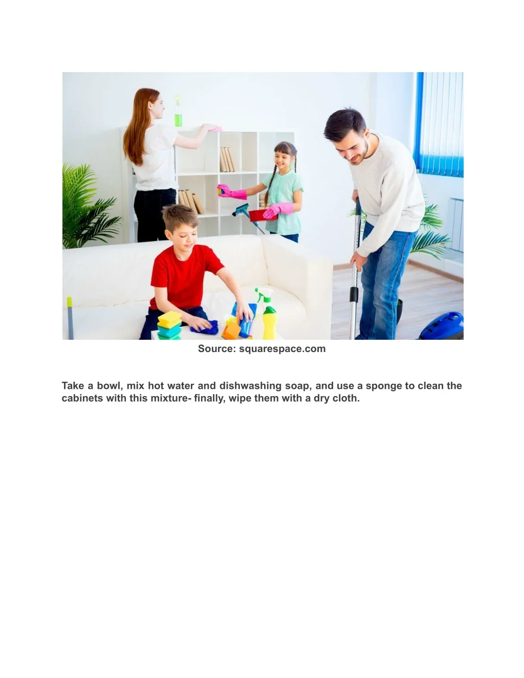 Source: squarespace.com Take a bowl, mix hot water and dishwashing soap, and use a sponge to clean the cabinets with this mixture- finally, wipe them with a dry cloth.