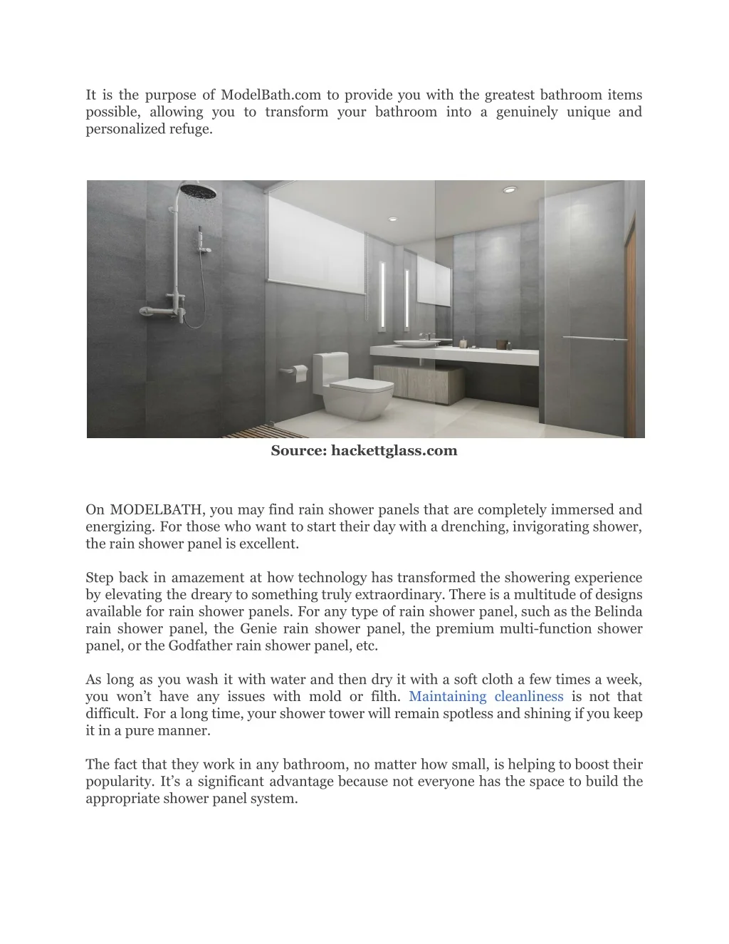 It is the purpose of ModelBath.com to provide you with the greatest bathroom items possible, allowing you to transform your bathroom into a genuinely unique and personalized refuge. Source: hackettglass.com On MODELBATH, you may find rain shower panels that are completely immersed and energizing. For those who want to start their day with a drenching, invigorating shower, the rain shower panel is excellent. Step back in amazement at how technology has transformed the showering experience by elevating the dreary to something truly extraordinary. There is a multitude of designs available for rain shower panels. For any type of rain shower panel, such as the Belinda rain shower panel, the Genie rain shower panel, the premium multi-function shower panel, or the Godfather rain shower panel, etc. As long as you wash it with water and then dry it with a soft cloth a few times a week, you won’t have any issues with mold or filth. Maintaining cleanliness is not that difficult. For a long time, your shower tower will remain spotless and shining if you keep it in a pure manner. The fact that they work in any bathroom, no matter how small, is helping to boost their popularity. It’s a significant advantage because not everyone has the space to build the appropriate shower panel system.