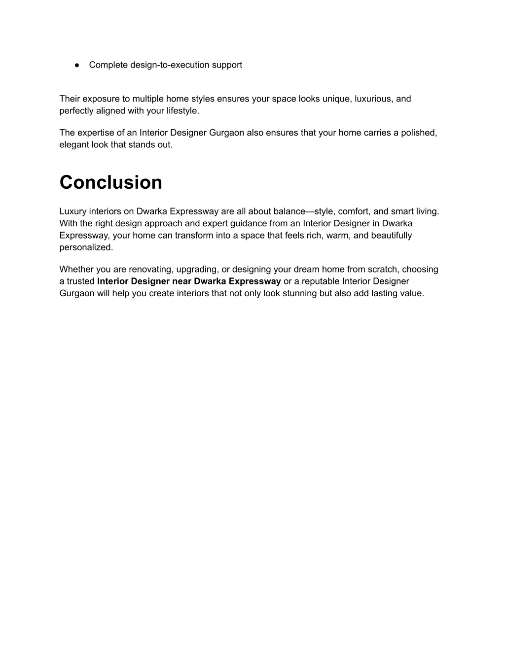 ● Complete design-to-execution support Their exposure to multiple home styles ensures your space looks unique, luxurious, and perfectly aligned with your lifestyle. The expertise of an Interior Designer Gurgaon also ensures that your home carries a polished, elegant look that stands out. Conclusion Luxury interiors on Dwarka Expressway are all about balance—style, comfort, and smart living. With the right design approach and expert guidance from an Interior Designer in Dwarka Expressway, your home can transform into a space that feels rich, warm, and beautifully personalized. Whether you are renovating, upgrading, or designing your dream home from scratch, choosing a trusted Interior Designer near Dwarka Expressway or a reputable Interior Designer Gurgaon will help you create interiors that not only look stunning but also add lasting value.