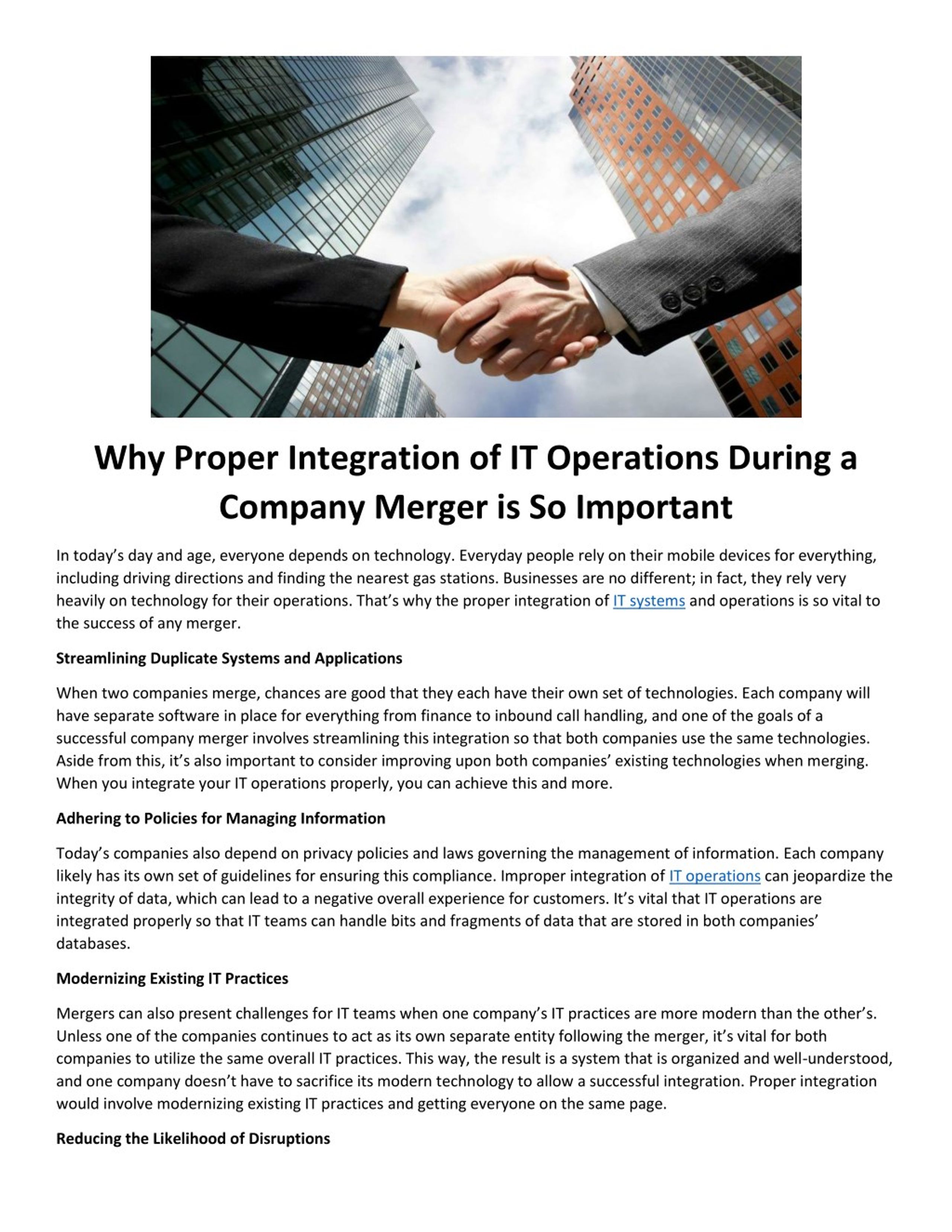 Why Proper Integration of IT Operations During a Company Merger is So Important In today’s day and age, everyone depends on technology. Everyday people rely on their mobile devices for everything, including driving directions and finding the nearest gas stations. Businesses are no different; in fact, they rely very heavily on technology for their operations. That’s why the proper integration of IT systems and operations is so vital to the success of any merger. Streamlining Duplicate Systems and Applications When two companies merge, chances are good that they each have their own set of technologies. Each company will have separate software in place for everything from finance to inbound call handling, and one of the goals of a successful company merger involves streamlining this integration so that both companies use the same technologies. Aside from this, it’s also important to consider improving upon both companies’ existing technologies when merging. When you integrate your IT operations properly, you can achieve this and more. Adhering to Policies for Managing Information Today’s companies also depend on privacy policies and laws governing the management of information. Each company likely has its own set of guidelines for ensuring this compliance. Improper integration of IT operations can jeopardize the integrity of data, which can lead to a negative overall experience for customers. It’s vital that IT operations are integrated properly so that IT teams can handle bits and fragments of data that are stored in both companies’ databases. Modernizing Existing IT Practices Mergers can also present challenges for IT teams when one company’s IT practices are more modern than the other’s. Unless one of the companies continues to act as its own separate entity following the merger, it’s vital for both companies to utilize the same overall IT practices. This way, the result is a system that is organized and well-understood, and one company doesn’t have to sacrifice its modern technology to allow a successful integration. Proper integration would involve modernizing existing IT practices and getting everyone on the same page. Reducing the Likelihood of Disruptions