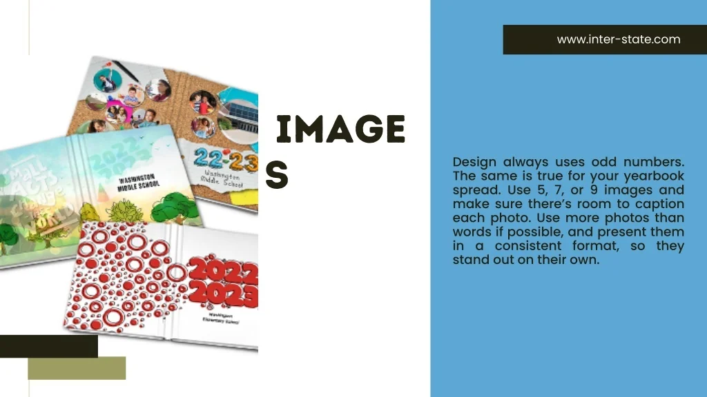 www.inter-state.com Image s Design always uses odd numbers. The same is true for your yearbook spread. Use 5, 7, or 9 images and make sure there’s room to caption each photo. Use more photos than words if possible, and present them in a consistent format, so they stand out on their own.