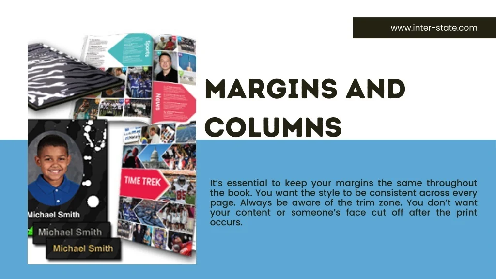 www.inter-state.com Margins and Columns It’s essential to keep your margins the same throughout the book. You want the style to be consistent across every page. Always be aware of the trim zone. You don’t want your content or someone’s face cut off after the print occurs.