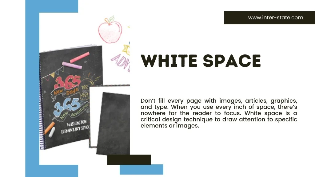 www.inter-state.com White Space Don’t fill every page with images, articles, graphics, and type. When you use every inch of space, there’s nowhere for the reader to focus. White space is a critical design technique to draw attention to specific elements or images.