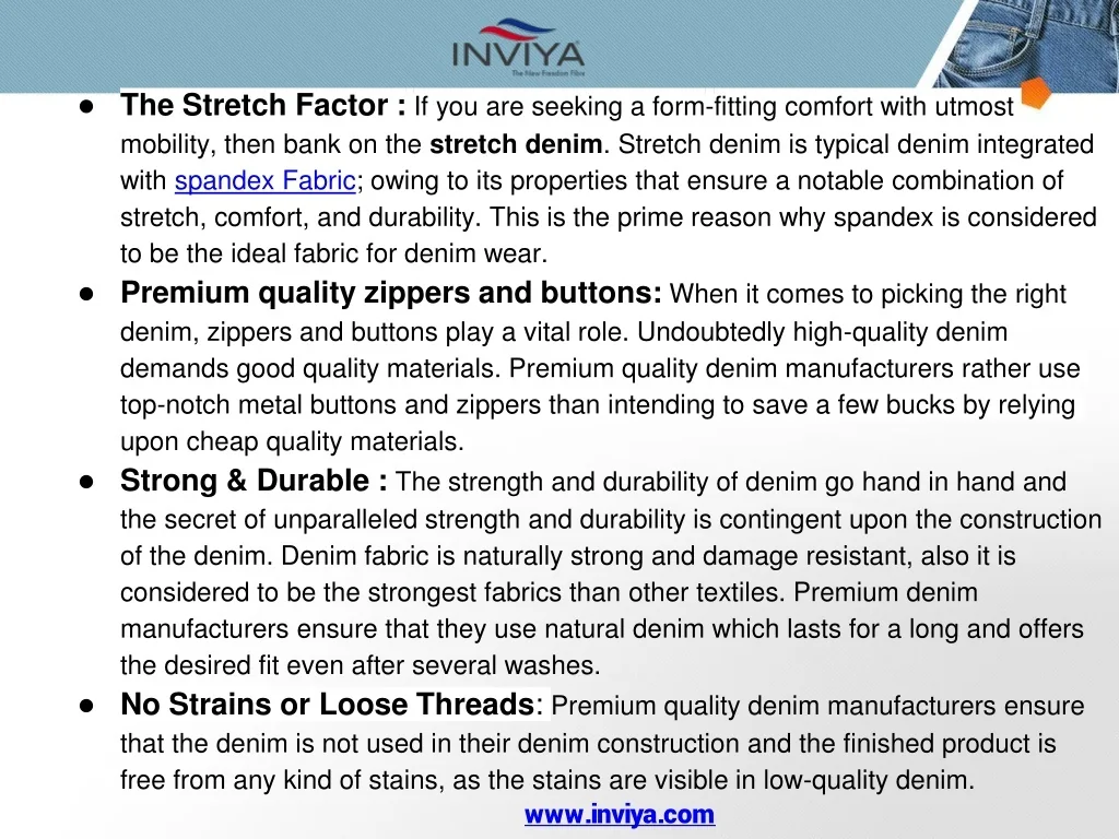 Add some text to the title slide • The Stretch Factor :If you are seeking a form-fitting comfort with utmost mobility, then bank on the stretch denim. Stretch denim is typical denim integrated withspandex Fabric; owing to its properties that ensure a notable combination of stretch, comfort, and durability. This is the prime reason why spandex is considered to be the ideal fabric for denim wear. • Premium quality zippers and buttons:When it comes to picking the right denim, zippers and buttons play a vital role. Undoubtedly high-quality denim demands good quality materials. Premium quality denim manufacturers rather use top-notch metal buttons and zippers than intending to save a few bucks by relying upon cheap quality materials. • Strong & Durable :The strength and durability of denim go hand in hand and the secret of unparalleled strength and durability is contingent upon the construction of the denim. Denim fabric is naturally strong and damage resistant, also it is considered to be the strongest fabrics than other textiles. Premium denim manufacturers ensure that they use natural denim which lasts for a long and offers the desired fit even after several washes. • No Strains or Loose Threads: Premium quality denim manufacturers ensure that the denim is not used in their denim construction and the finished product is free from any kind of stains, as the stains are visible in low-quality denim. www.inviya.com