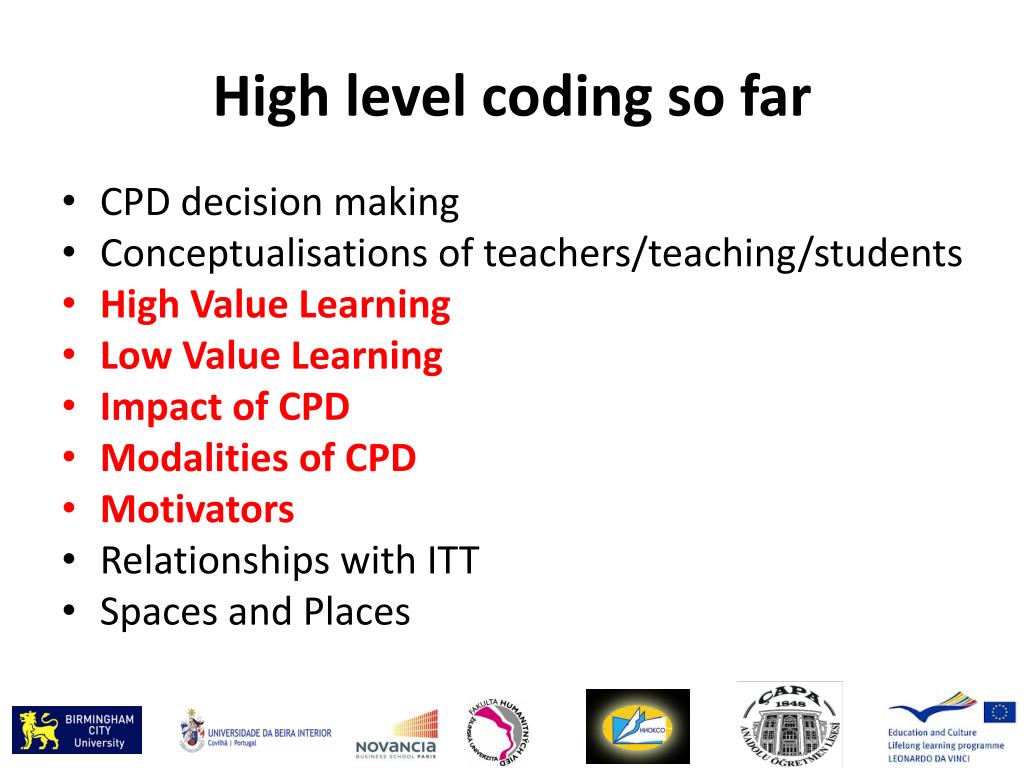 High level coding so far • CPD decision making • Conceptualisations of teachers/teaching/students • High Value Learning • Low Value Learning • Impact of CPD • Modalities of CPD • Motivators • Relationships with ITT • Spaces and Places