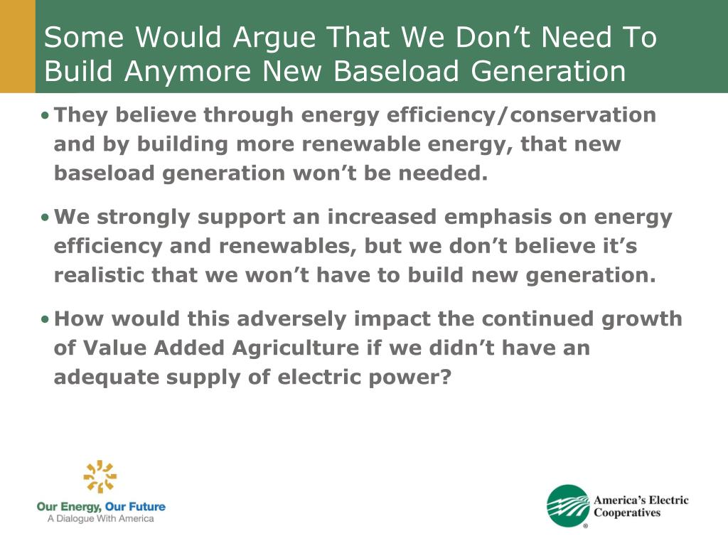Some Would Argue That We Don’t Need To Build Anymore New Baseload Generation • They believe through energy efficiency/conservation and by building more renewable energy, that new baseload generation won’t be needed. • We strongly support an increased emphasis on energy efficiency and renewables, but we don’t believe it’s realistic that we won’t have to build new generation. • How would this adversely impact the continued growth of Value Added Agriculture if we didn’t have an adequate supply of electric power?