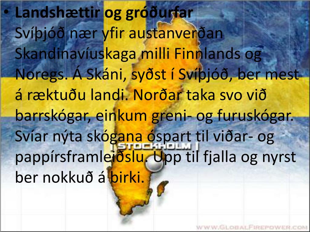 2. Landshættir og gróðurfarSvíþjóð nær yfir austanverðan Skandinavíuskaga milli Finnlands og Noregs. Á Skáni, syðst í Svíþjóð, ber mest á ræktuðu landi. Norðar taka svo við barrskógar, einkum greni- og furuskógar. Svíar nýta skógana óspart til viðar- og pappírsframleiðslu. Upp til fjalla og nyrst ber nokkuð á birki.