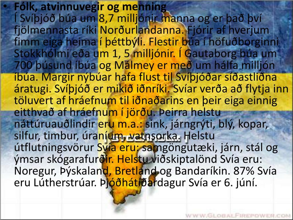3. Fólk, atvinnuvegir og menningÍ Svíþjóð búa um 8,7 milljónir manna og er það því fjölmennasta ríki Norðurlandanna. Fjórir af hverjum fimm eiga heima í þéttbýli. Flestir búa í höfuðborginni Stokkhólmi eða um 1, 5 milljónir. Í Gautaborg búa um 700 þúsund íbúa og Málmey er með um hálfa milljón íbúa. Margir nýbúar hafa flust til Svíþjóðar síðastliðna áratugi. Svíþjóð er mikið iðnríki. Svíar verða að flytja inn töluvert af hráefnum til iðnaðarins en þeir eiga einnig eitthvað af hráefnum í jörðu. Þeirra helstu náttúruauðlindir eru m.a.: sink, járngrýti, blý, kopar, silfur, timbur, úraníum, vatnsorka. Helstu útflutningsvörur Svía eru: samgöngutæki, járn, stál og ýmsar skógarafurðir. Helstu viðskiptalönd Svía eru: Noregur, Þýskaland, Bretland og Bandaríkin. 87% Svía eru Lútherstrúar. Þjóðhátíðardagur Svía er 6. júní.