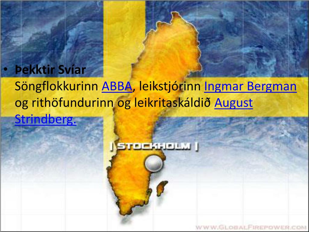 4. Þekktir SvíarSöngflokkurinn ABBA, leikstjórinn Ingmar Bergman og rithöfundurinn og leikritaskáldið August Strindberg.