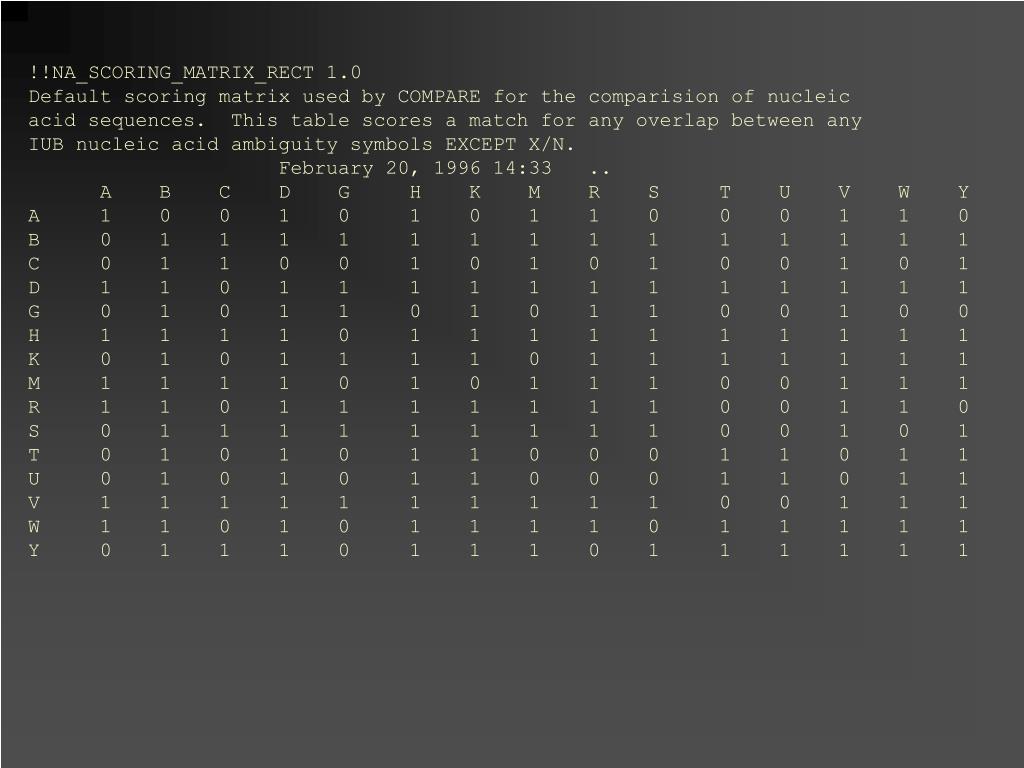 Symbol Comparison Tables(Scoring Matrices) • What is a match? • Define match values for all GCG symbols • Nucleotides • Amino acids • Located in GenRunData:*.cmp