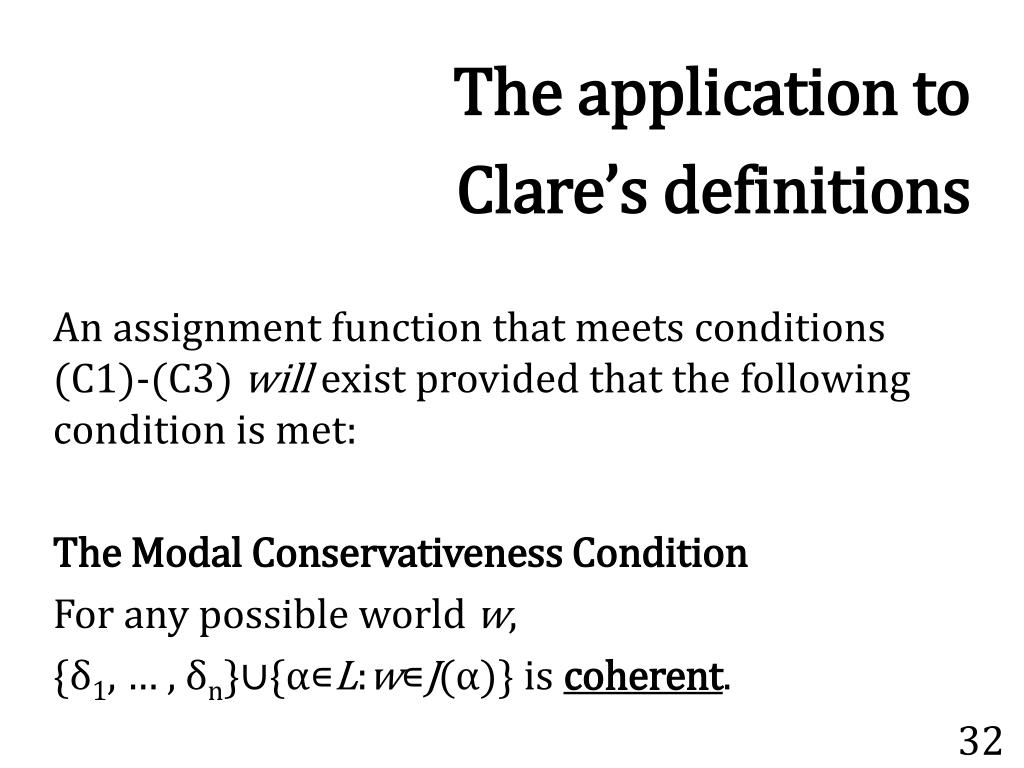 The application to Clare’s definitions An assignment function that meets conditions (C1)-(C3) will exist provided that the following condition is met: The Modal Conservativeness Condition For any possible world w, {δ1, … , δn}∪{α∊L:w∊J(α)} is coherent.