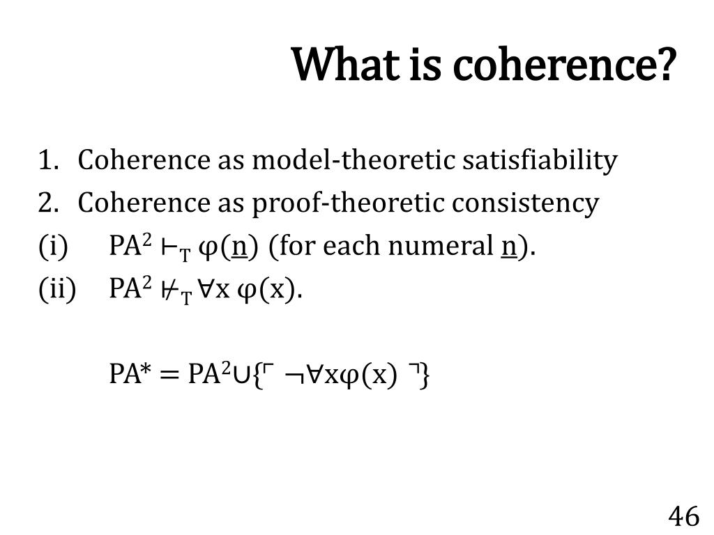 What is coherence? • Coherence as model-theoretic satisfiability • Coherence as proof-theoretic consistency (i) PA2⊢Tφ(n) (for each numeral n). (ii)PA2⊬T ∀x φ(x). PA* = PA2∪{⌜¬∀xφ(x)⌝}