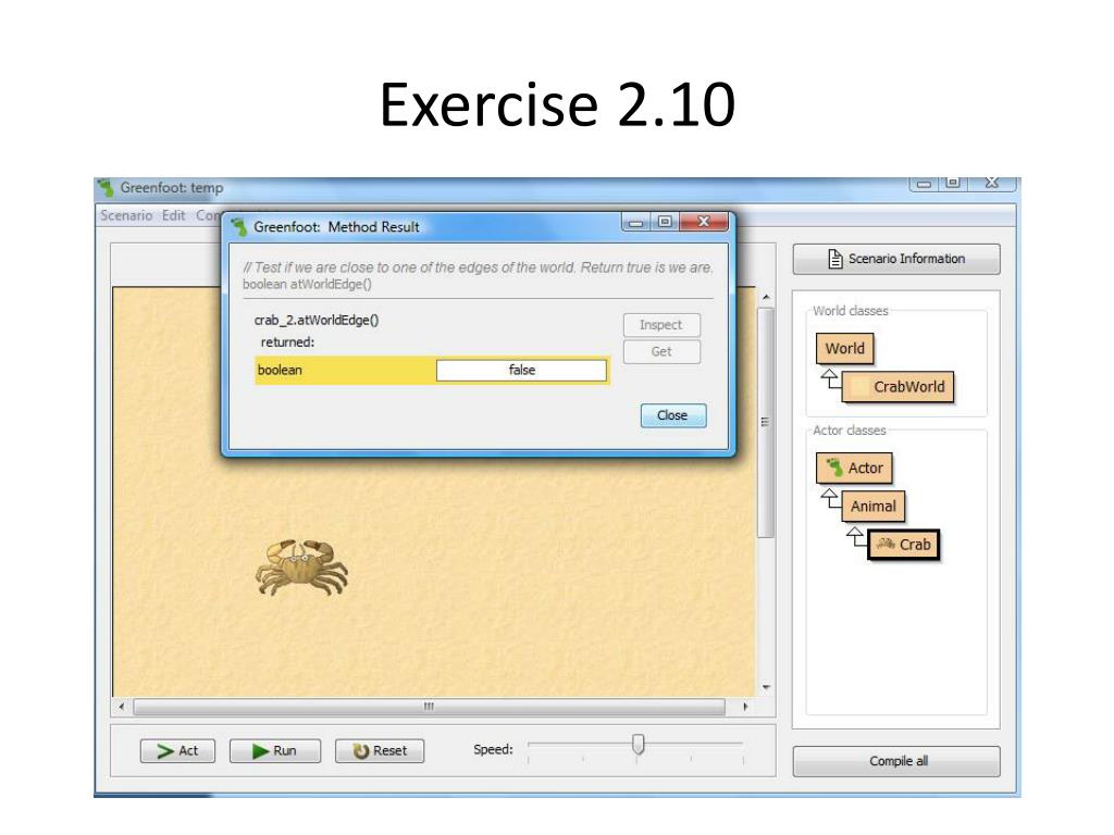 Exercise 2.2 Right Click on the Crab Class Drag a Crab into the World Click the Act and Run Buttons