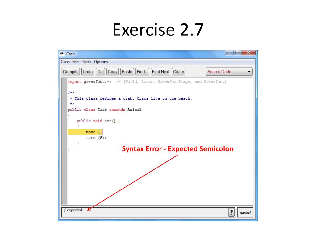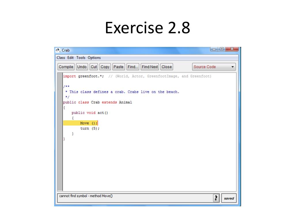 Exercise 2.8 • ‘;’ expected • cannot find symbol - method Move() • turn(int) in Animal cannot be applied to (int,int) • turn(int) in Animal cannot be applied to (double) • act() in Crab cannot override act() in Animal; attempting to use incompatible return type • cannot find symbol - class voids • unclosed comment • class, interface, or enum expected • illegal start of type • illegal start of expression